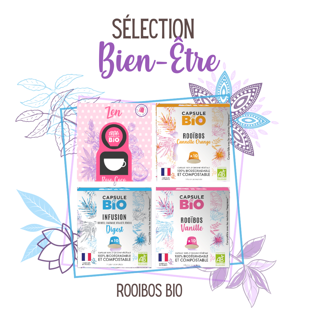Capsul&bio vous propose sa sélection de recettes relaxantes : le coffret BIEN-ÊTRE de 4 recettes de rooibos bio: